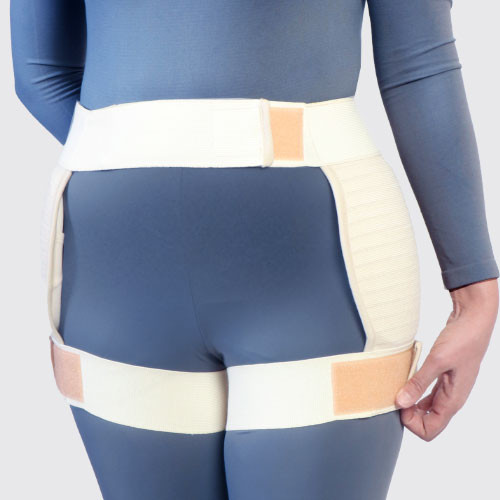 · کشها را با استفاده از چسبکهای پشت و جلو به دور کمر خود بگونهای ببندید که پدهای لگنی بصورت متقارن در دو طرف لگن قرار بگیرند و برجستگیهای مفصل ران را کاملاً پوشش دهند